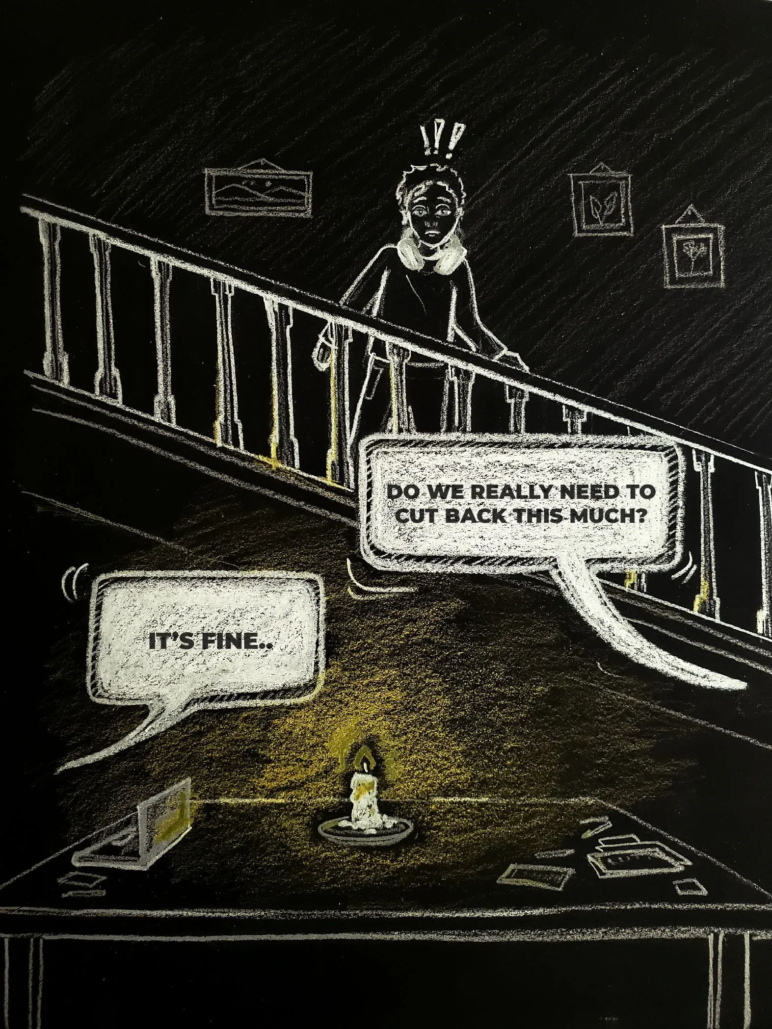 “Mom? Dad?” he called while walking down the stairs. No answer. “Mom? Dad?” Still no answer. As he turned the corner to his kitchen, Corvin saw a dimly lit candle lighting up the dinner table. His mom was scribbling numbers onto a notebook, while his dad stared at a spreadsheet on his old laptop. Corvin opened his mouth to complain, but nothing came out when he heard his mom’s voice.