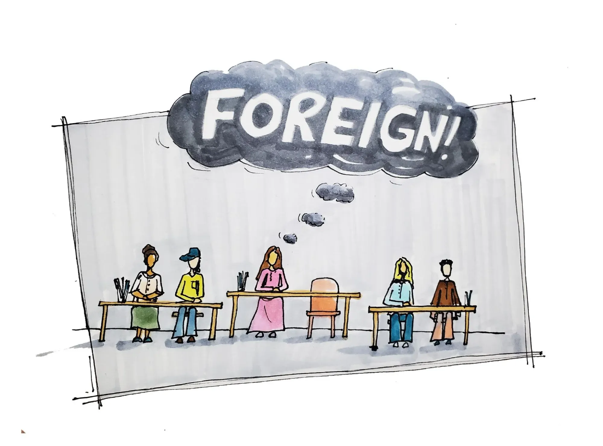 The room buzzed with the sound of pencils scratching paper, chairs scraping against the floor, and whispers of conversations I couldn't understand. I sat stiffly at my desk, my hands fisted so tightly my knuckles turned white. The word foreign hung over me like a storm cloud, relentless and unshakable.